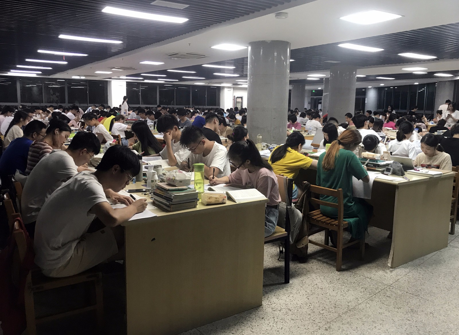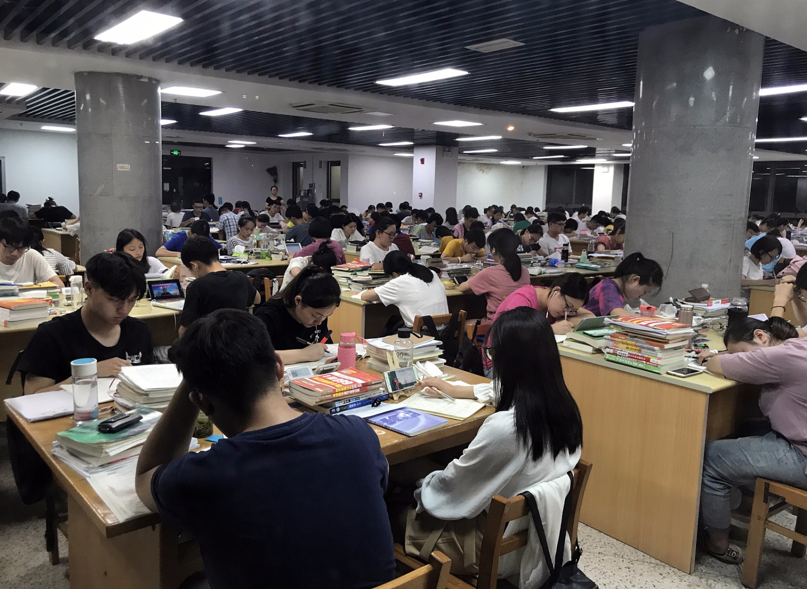 当晚,在安徽六安市皖西学院校园内,许多准备考研的大三学生在路灯下背单词,而可以容纳上千人的图书馆4个大型阅览室,更是挤满了复习考研的学生。