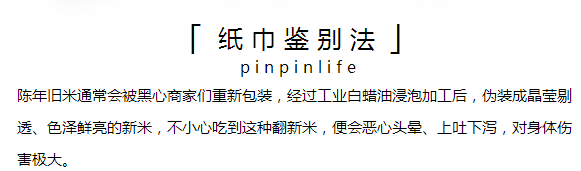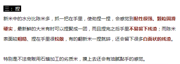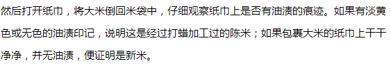 这种简单的、粗劣的“翻新米”可以用纸巾很快鉴别,但是有些被反复打蜡抛光过的陈米,加工过程更加精细,用纸巾无法准确鉴别。这时,就需要我们用上一些鉴别技巧,才不会被陈米的“外表”所欺骗。