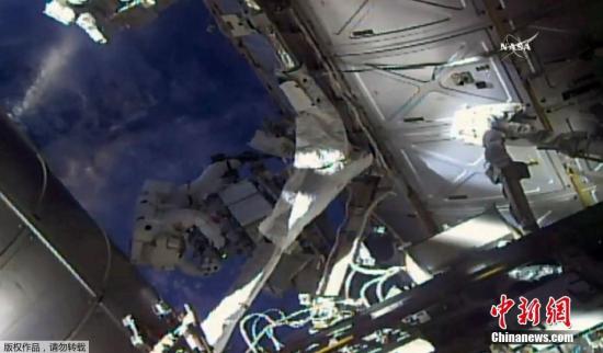 资料图:国际空间站上两名宇航员出舱太空行走,更换检查两个外置冷却箱。(视频截图)