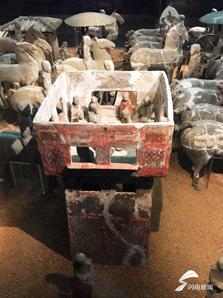 从车马出行主体内容看,大体可分为前、中、后三个部分。从阙门到院落大门前为第一部分,主要由骑俑及车马组成的护卫方阵,在前端两侧的阙楼中间向后有5辆独辕车和7组护卫骑俑组成。从前院大门内到后院大门前为第二部分,为步俑护卫方阵,主要步兵俑组成,可分为东西两组,西侧为站立步兵俑,手持盾牌;东侧主要为坐俑或蹲俑,中间有建鼓和击鼓手,并有个别的骑俑、文吏俑、侍从俑等。在大门内西侧站立步兵俑前还有2辆双辕牛车。