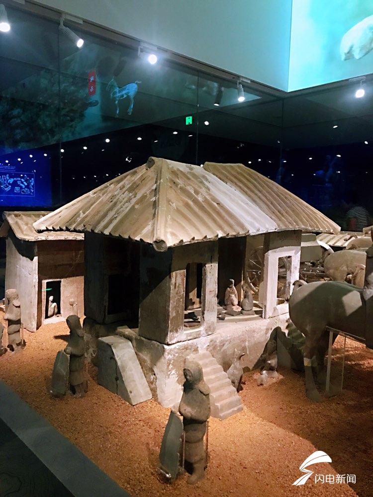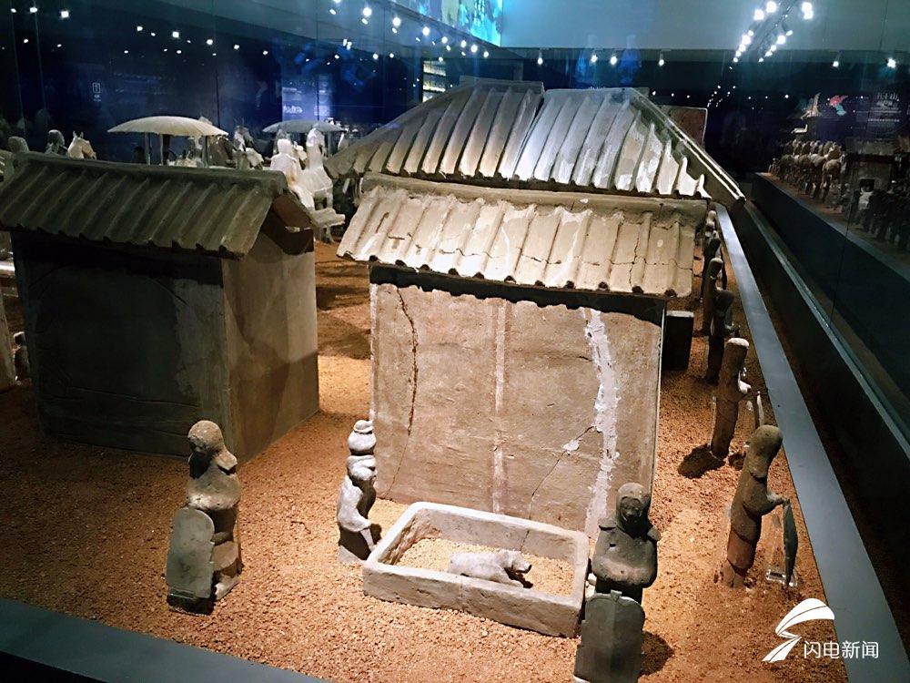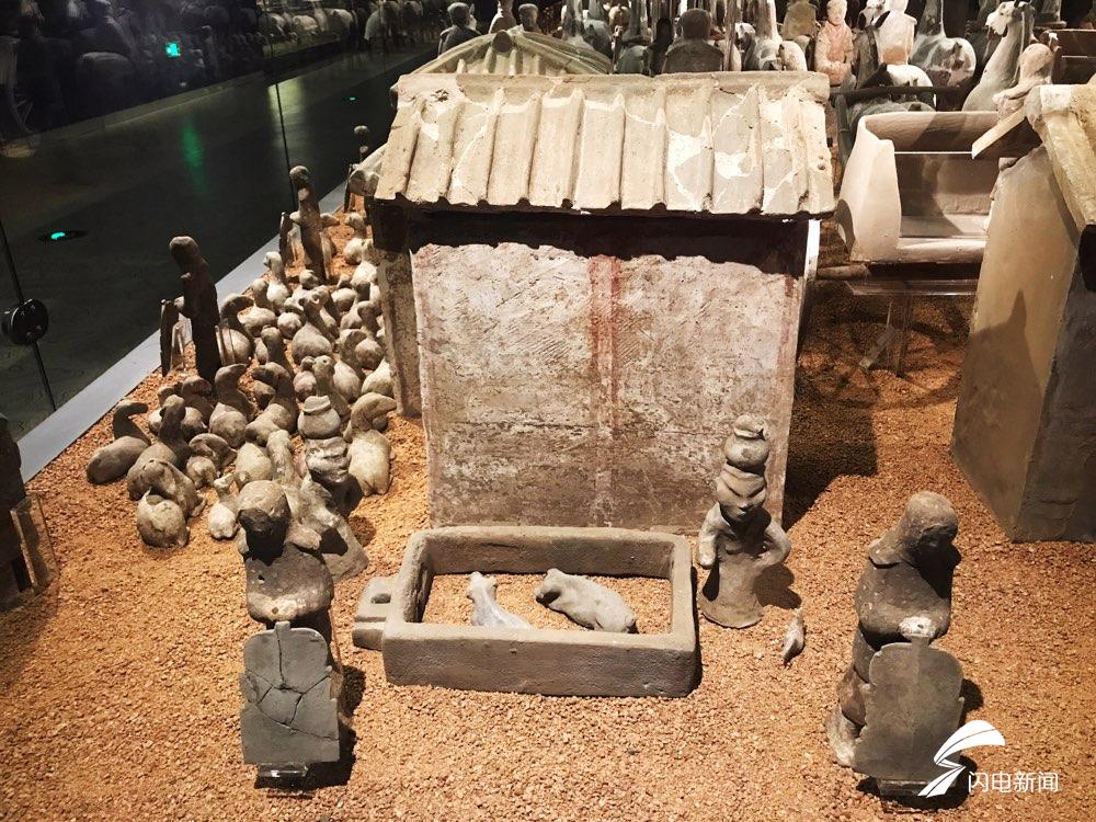 俑坑中的“宅院建筑”也很特殊,属于三进式的“日”字形前庭后室结构。前大门偏于俑坑西侧,顶为悬山顶,东西有庇顶,两侧有门房,大门内为宽阔的庭院。后院大门与前大门前后相对,结构基本相同。院内西侧前为戏楼,楼上还有正在表演的戏俑、鼓乐俑等,观赏演出的主人一边享用桌上餐具中精美的食物,一边观看表演,侍从则侍立其旁。