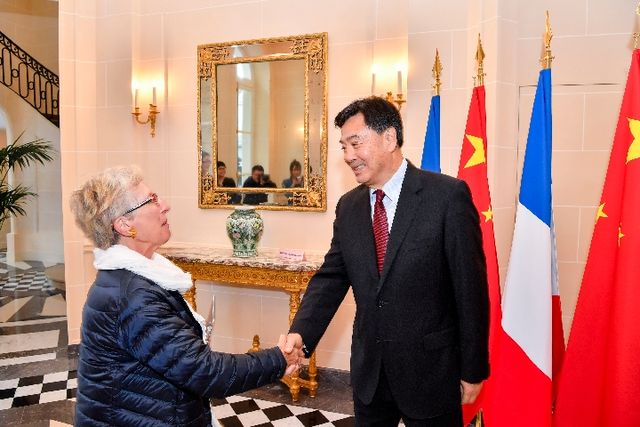 9月16日,中国驻法国大使翟隽(右)与参观者亲切握手。(新华社记者陈益宸摄)
