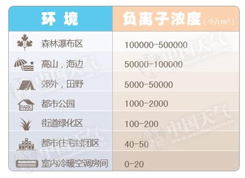 不同环境下负氧离子含量浓度对比表(谷成/制图)