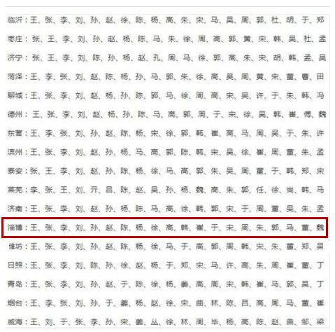 在山东姓氏排名中,与大多数的北方省份相同,王、张、李、刘位列前四。各城市排名也与山东省的排名大致相同,淄博排名前二十的姓氏分别是王、张、李、刘、孙、赵、陈、杨、徐、高、韩、崔、于、宋、周、朱、郭、马、董、魏,看来淄博还是王姓最多呀。