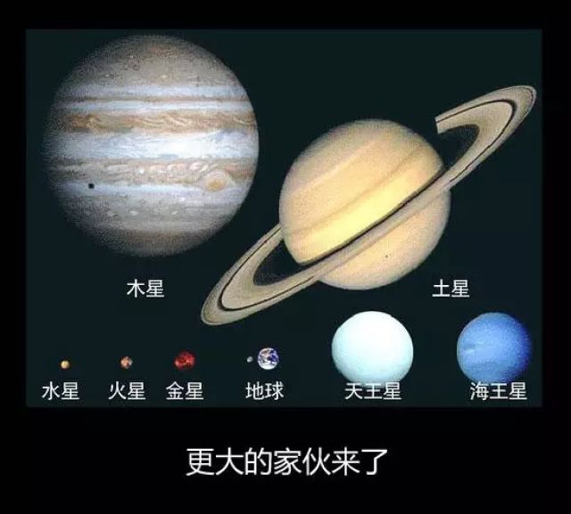 继续放大一级。土星相当于830个地球,木星有1300个地球那么大!