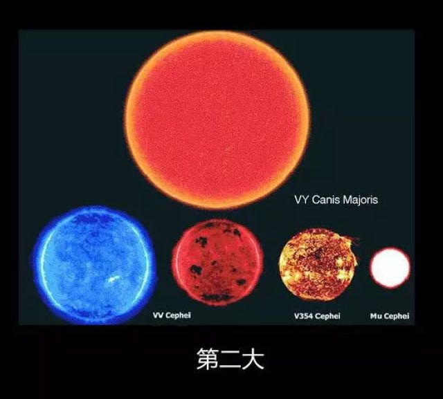 2012年以前,VY Canis Majoris(大犬座VY星)一直是坐在已经最大星球的头把交椅!体积,至少是太阳的80亿倍!哈哈哈,真疯狂!不过现在沦落到第二大了!