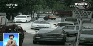 在车引擎盖上的执法人员李某的干扰下,车子撞向了隔离护栏,两位见义勇为的市民看到后开车拦截。