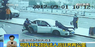 在车前方的执法人员李某来不及躲闪,跳起扑在了轿车的引擎盖上。其间该驾驶员非但不理会警方的喊话,反而加速逃逸并试图将执法人员甩下车。