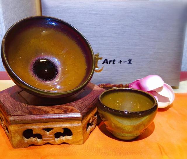 据了解,天目杯又称建盏,兴于晋盛于宋,是古代名瓷之一。天目杯釉彩的油滴、鹧鸪、兔毫等形象,均以拙朴深沉、令人沉醉为上品。