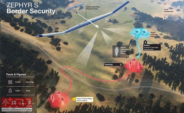 由于具备超长留空时间,超高飞行高度多种优势,太阳能无人机十分适合执行对地侦察任务,图为英国“西风”-S太阳能无人机执行边境巡逻及对地探测宣传图。