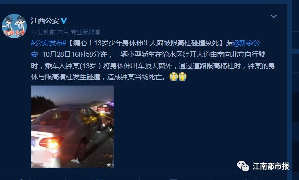 10月28日16时58分许,一辆小型轿车在渝水区经开大道由南向北方向行驶时,乘车人钟某(13岁)将身体伸出车顶天窗外,通过道路限高橫杠时,钟某的身体与限高横杠发生碰撞,造成钟某当场死亡。