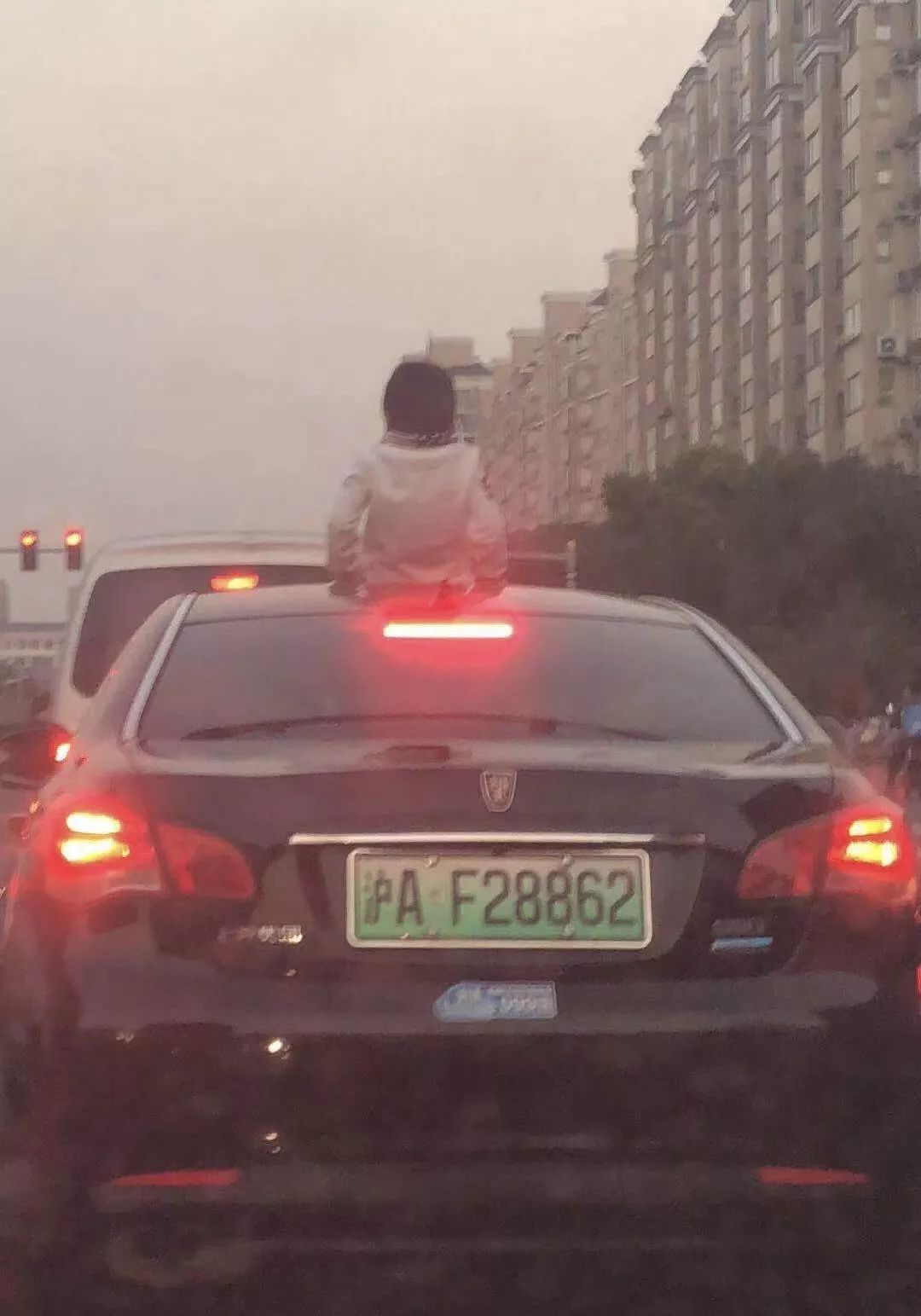 前车小孩头部伸出天窗外的场景