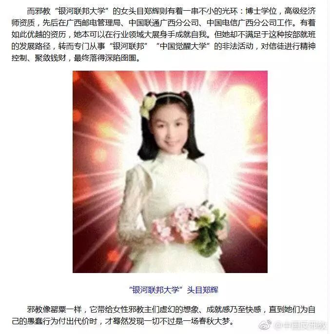 2015年7月,广西南宁市某区人民法院依法认定“银河联邦”为邪教组织。法院认为,郑辉冒用佛教的名义,在互联网上建立“银河联邦”网站,通过组织非法“法会”,制作、印刷、散布非法出版物、宣传品的形式,散布迷信邪说,蛊惑蒙骗他人,发展、控制众多信徒,形成危害社会的邪教组织,破坏国家法律实施,构成组织、利用邪教组织破坏法律实施罪,判处有期徒刑八年。