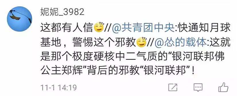 近日,微博@中国反邪教 发布了一条关于邪教“银河联邦”的微博,@共青团中央 随后进行了转载,进而引发了网友们的热议。