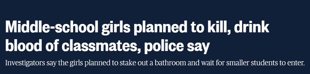 两名年约11、12岁女中学生自称信奉撒旦教,她们密谋用利刃及剪刀杀死15至25名同学。两人供称,打算袭击年幼学生,待她们进入厕所时用刀割破其喉咙、饮血,再肢解他们,吃其肉......