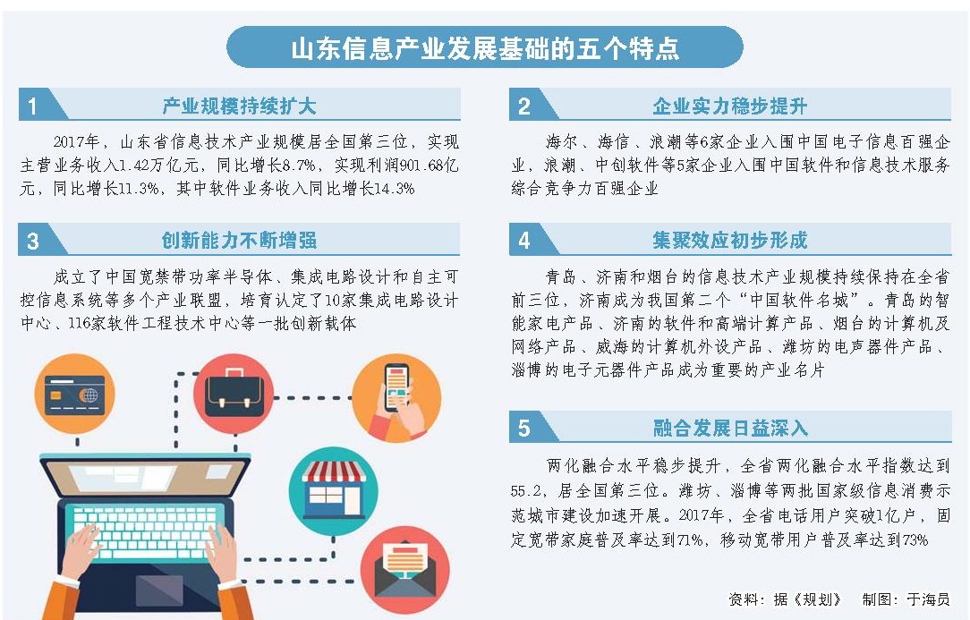 山东新旧动能转换“十强”产业中,新一代信息技术产业地位特殊,既是培育新动能的关键载体,又是传统动能改造提升的助燃剂。去年,全省信息技术产业实现主营业务收入1.42万亿元,居全国第三,但由于近年来投资偏少、重大项目建设滞后,产业发展速度受到一定影响,企业创新能力不足,研发投入强度不到5%,大规模集成电路晶圆制造、液晶面板生产等核心关键环节缺失。在充分论证信息技术演进趋势和我省产业发展现状基础上,《规划》针对我省新一代信息技术产业的优势、核心、前沿领域分别制定了争一流、补短板、抢布局的发展定位。