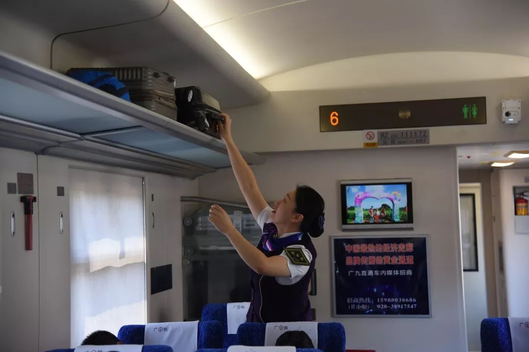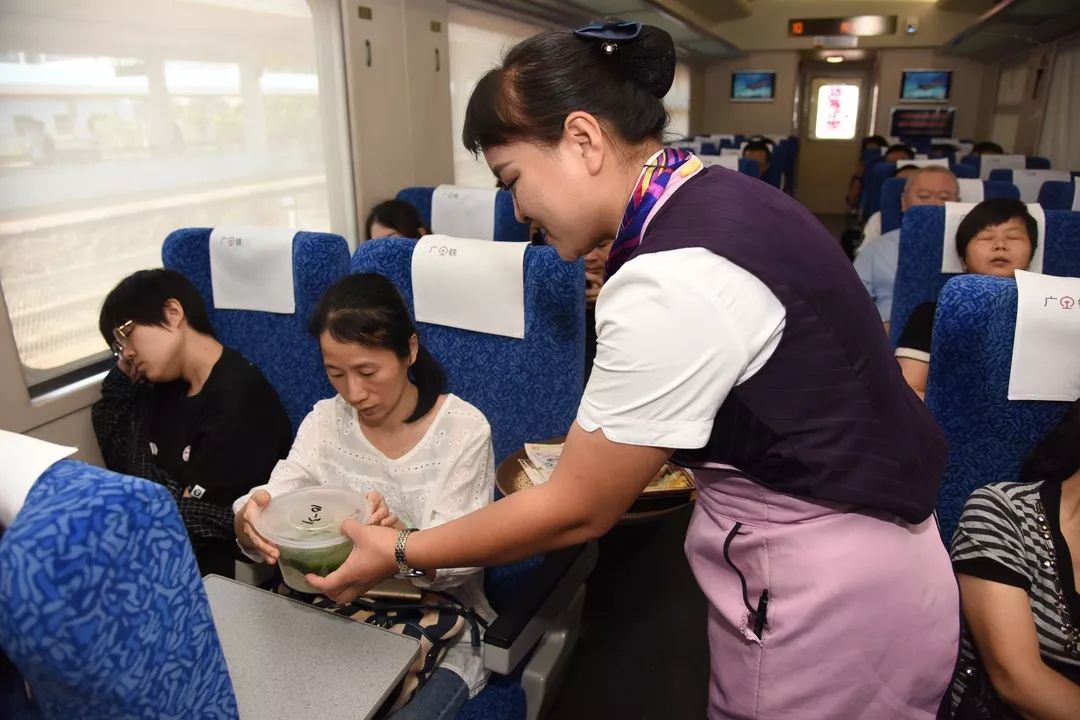 列车员们开始整理行李架,为一些持有护照的外籍旅客发放入境卡。这是广九直通车独有的服务。餐车的工作人员在车厢里来回走动,让旅客不需要走动,就能享受点餐、送餐、购物服务。