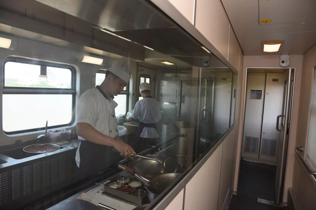 餐车的厨房是用玻璃与外面隔开,站在走道上,可以看到大厨们正在精心制作。厨房内的设施、大厨们的着装、炒菜的过程,在列车过道中就能一览无余。这种开放式厨房也是广九直通车所独有的。