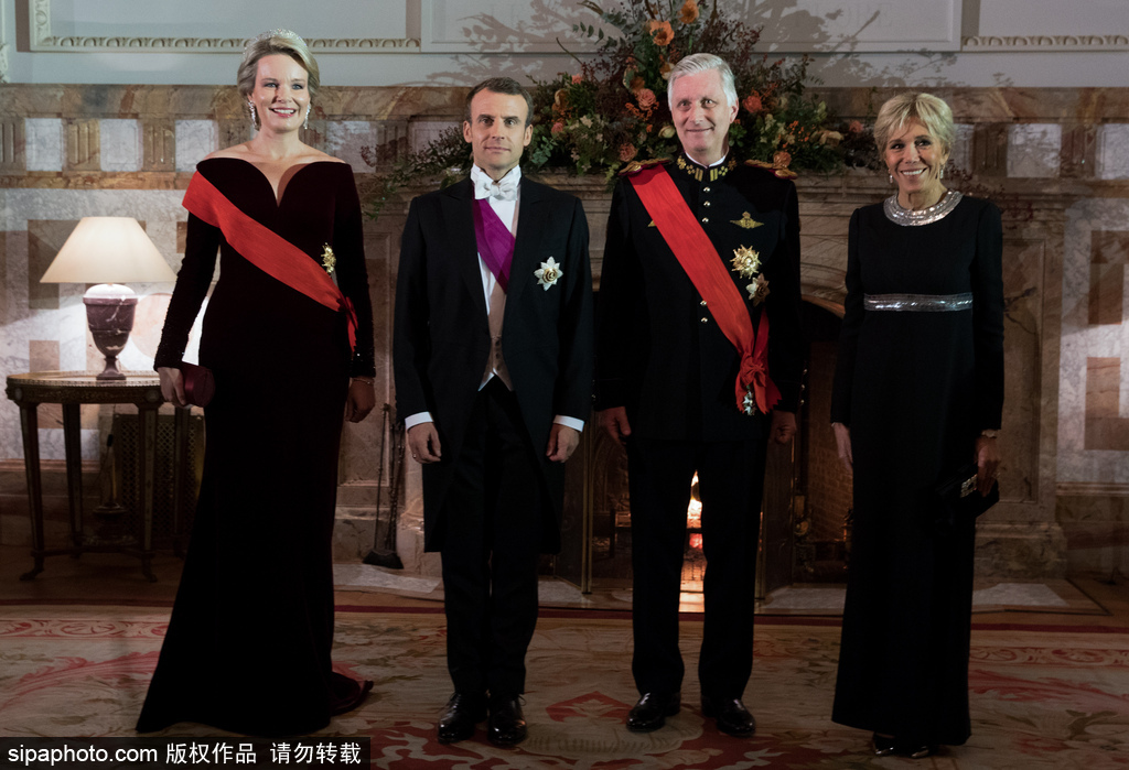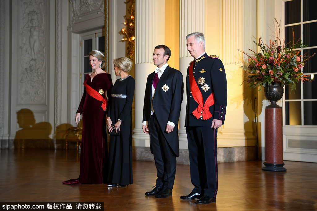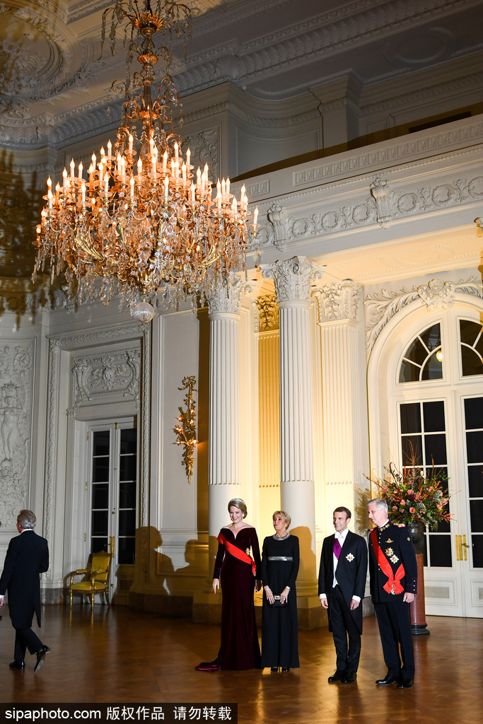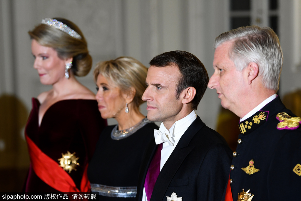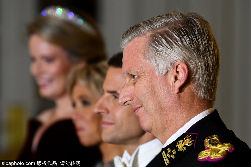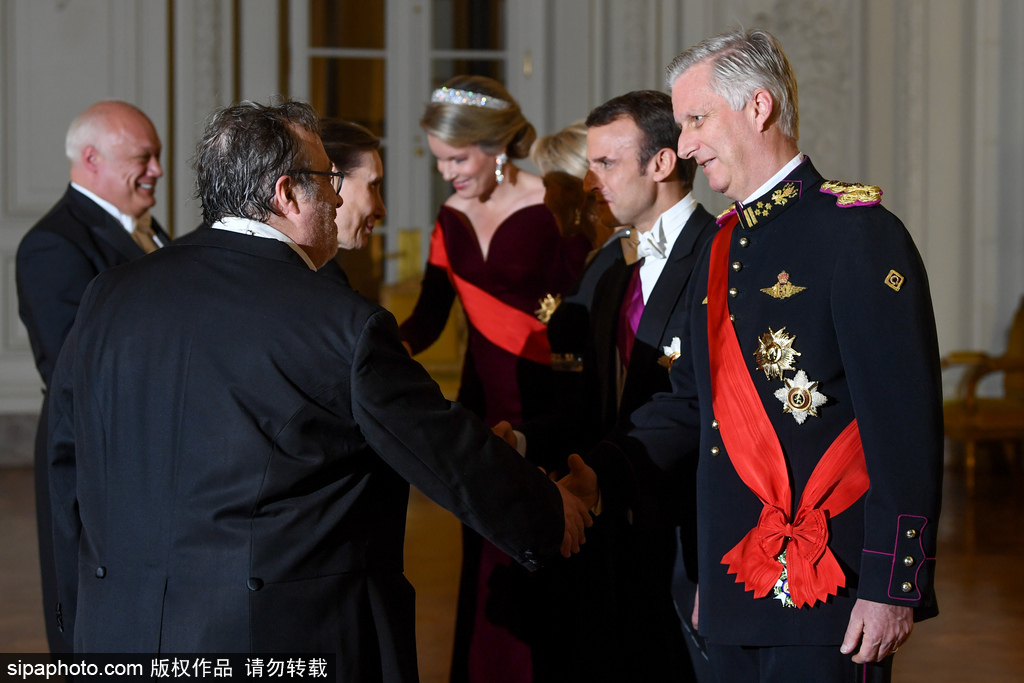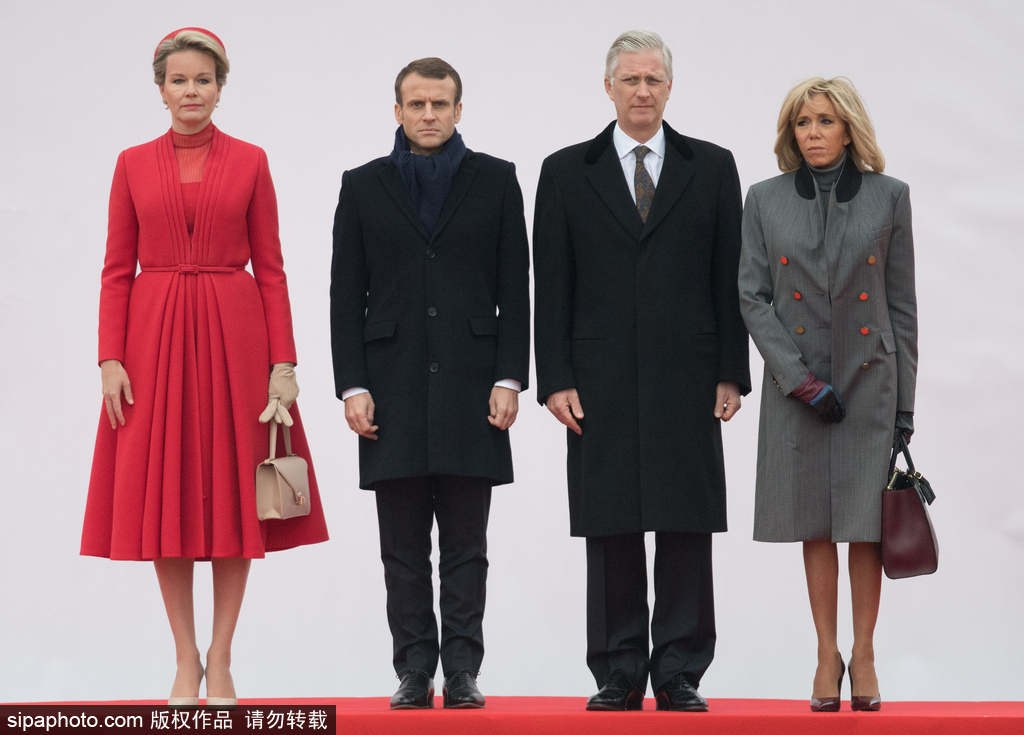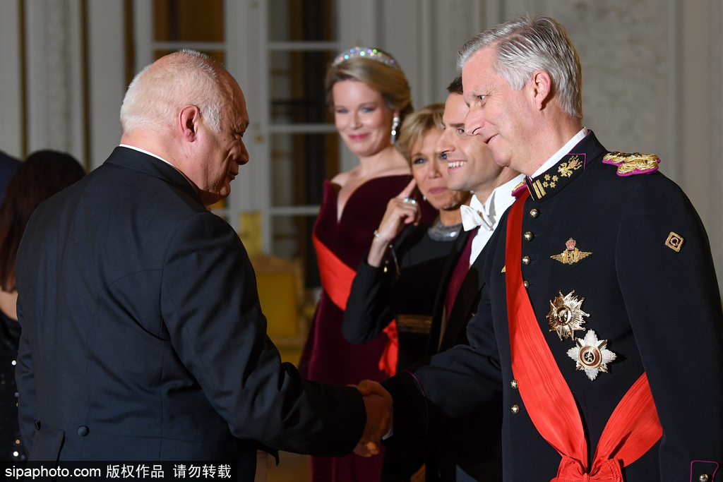 当地时间2018年11月19日,比利时布鲁塞尔,法国总统马克龙和夫人布丽吉特·马克龙对比利时进行国事访问,比利时国王菲利普与王后玛蒂尔德亲自迎接。