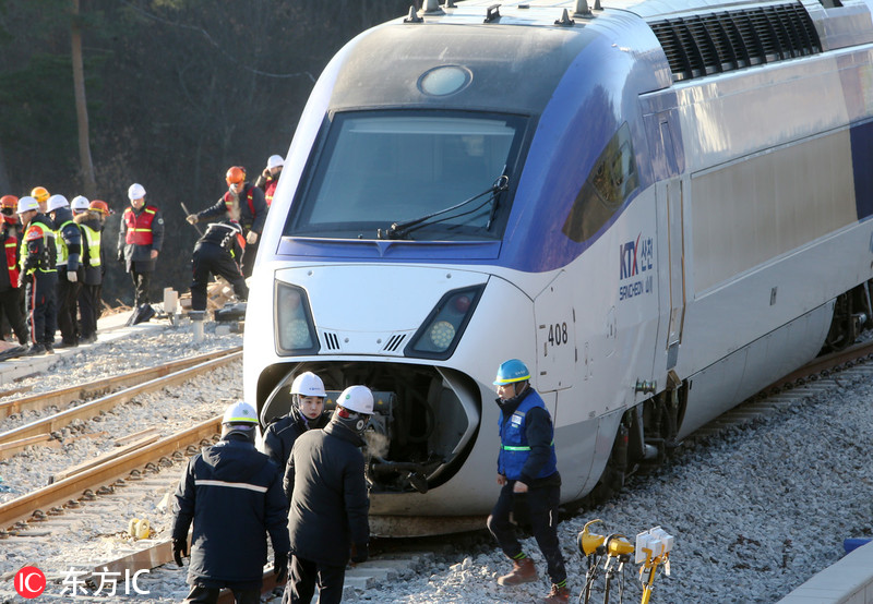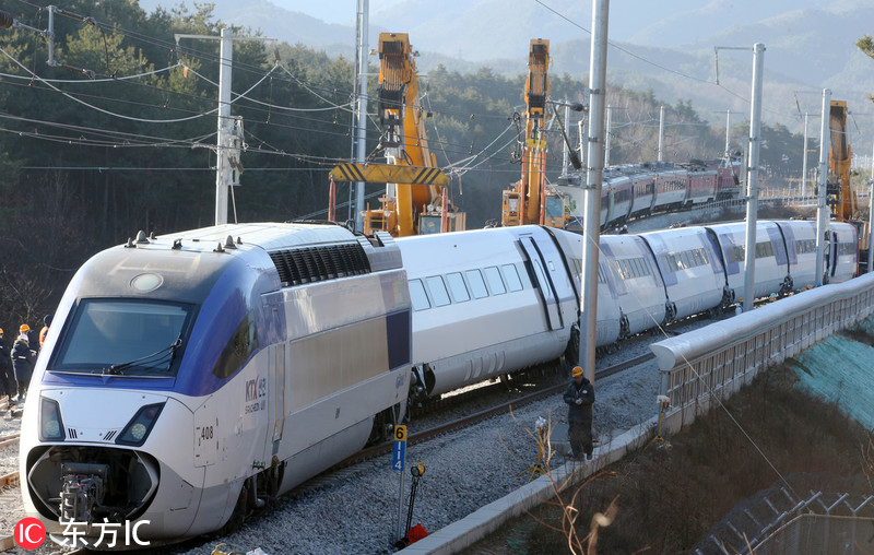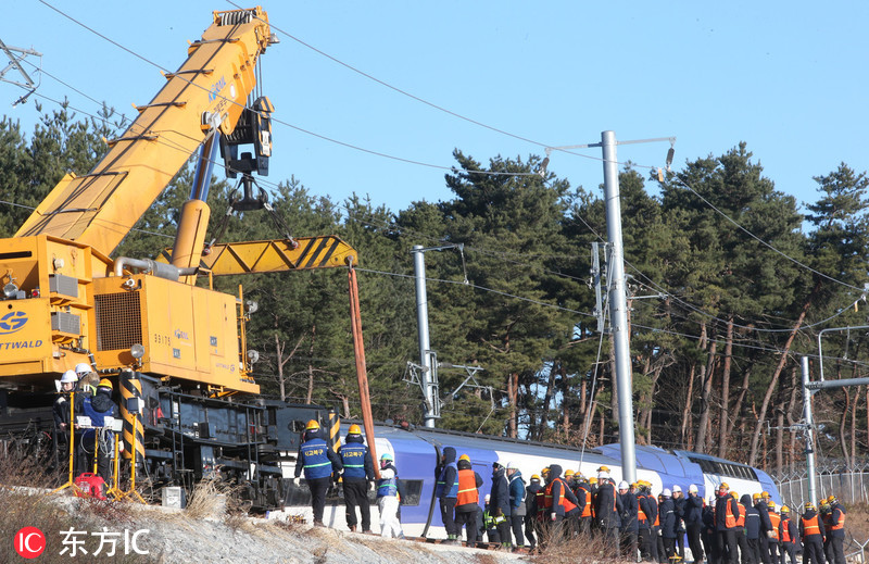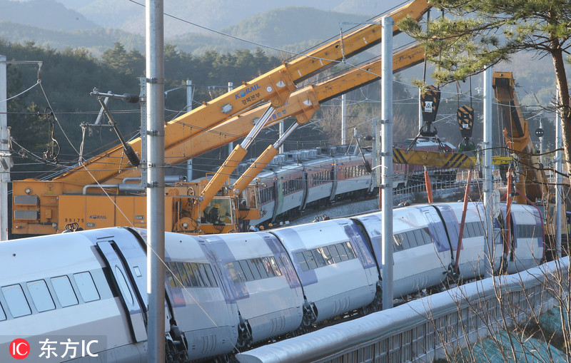 当地时间2018年12月9日,韩国江原道江陵市,韩国铁道公社派出起重机等设备清理列车脱轨事故现场。8日上午,从江陵站开往首尔站的高铁列车出发5分钟后发生脱轨事故,有14名乘客受伤。