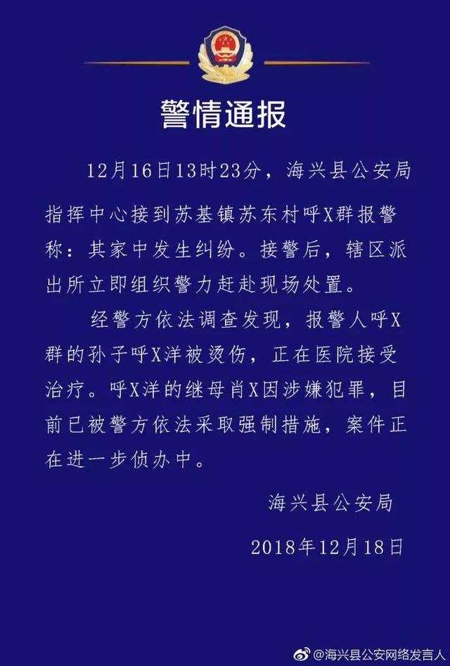 经警方依法调查发现,报警人呼某群的孙子呼某洋被烫伤,正在医院接受治疗。呼某洋的继母肖某因涉嫌犯罪,目前已被警方依法采取强制措施,案件正在进一步侦办中。