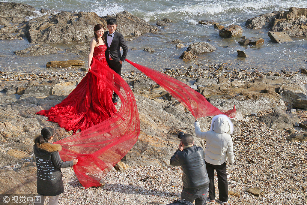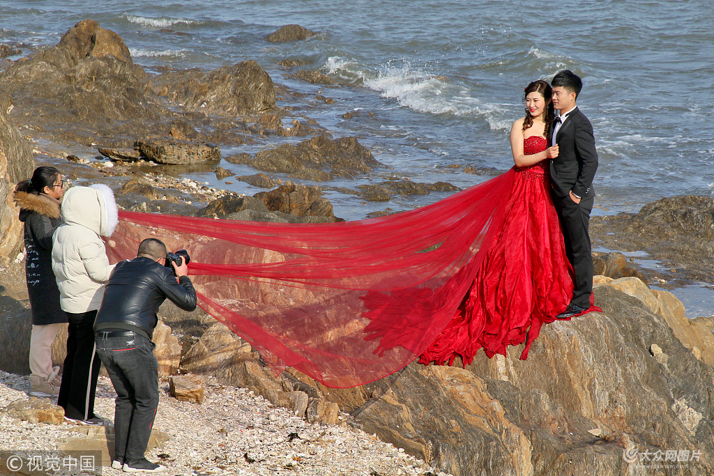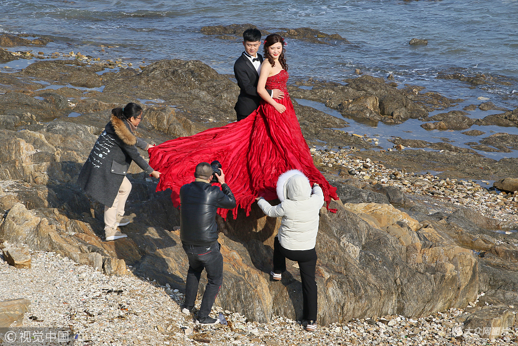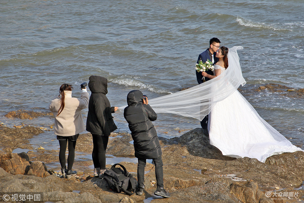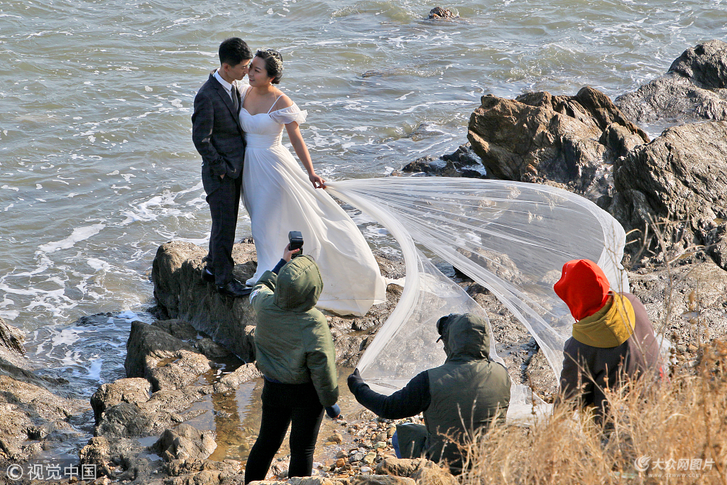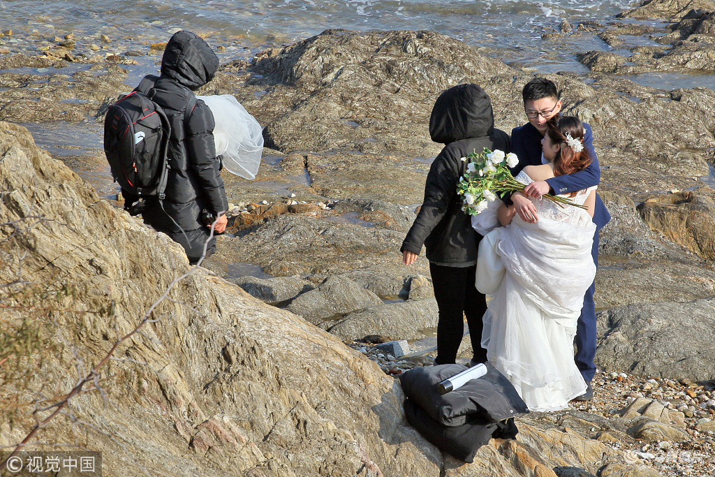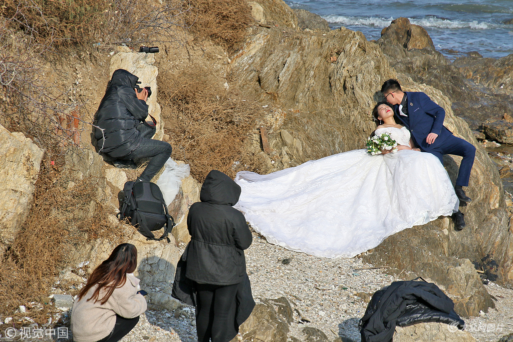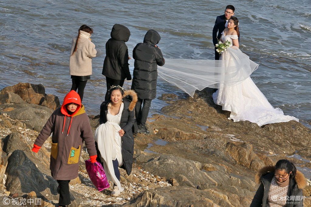 2018年12月23日,山东烟台,几对婚期紧张的新人正在寒风凛冽,气温接近0℃的海边拍摄婚纱照,工作人员与新娘冰火两重天的穿着形成鲜明对比。