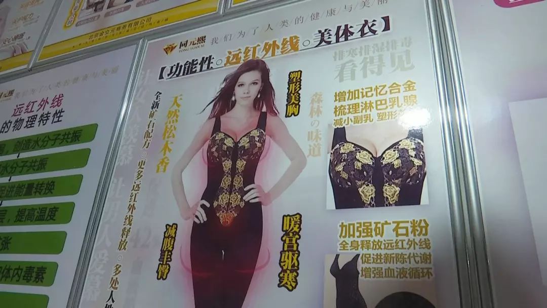 养生会馆的墙上贴满了一款品牌名为“同元熙”的美体衣宣传海报,海报上还有“远红外线、暖宫驱寒、改善静脉曲张”等字眼,但是没有显示可以治疗疾病。黄大姨说,自己买的就是墙上贴的这款。