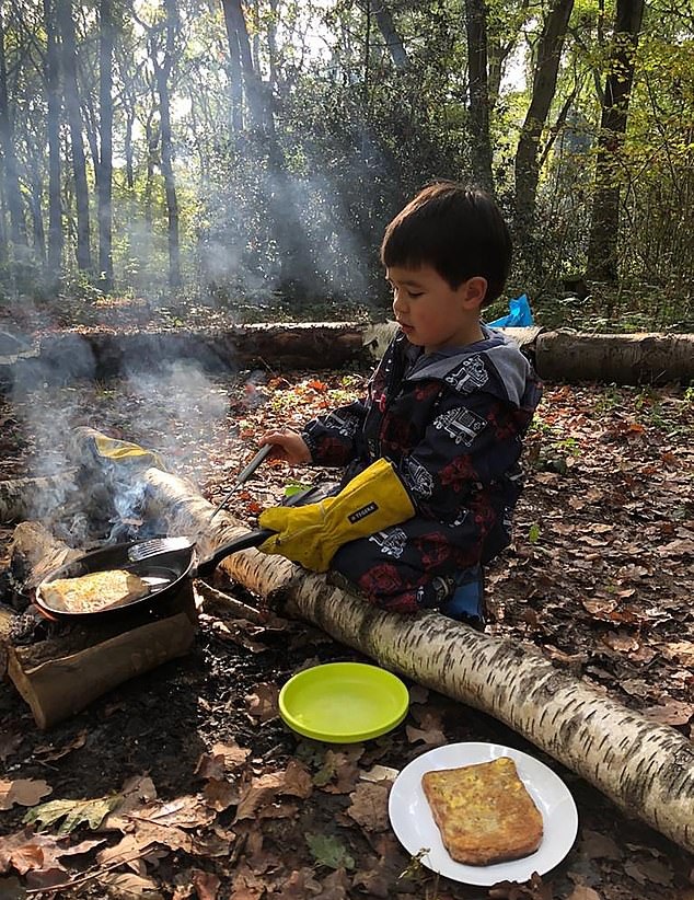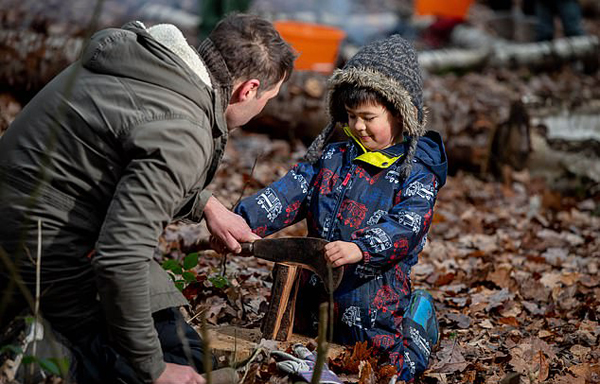 两到五岁的孩子们在杰克园长的带领下学习生火、用刀等生存技能,还能用弓锯和砍刀搭建帐篷,也会学习如何在森林中寻找食物。不论刮风下雨,孩子们都是在户外学习这些知识或技能,空下来的时候,还会在自己搭建的帐篷里生火,围着火堆纵情高歌。