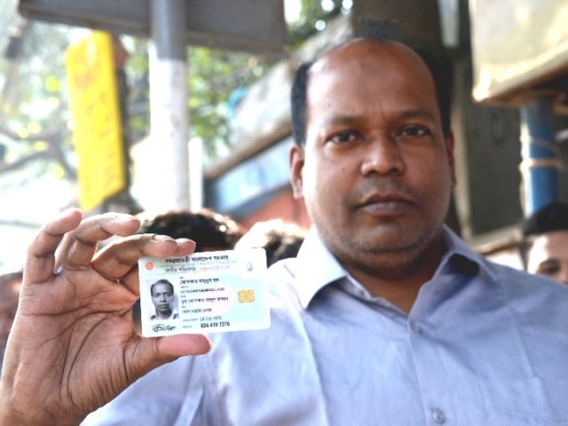 12月30日,在孟加拉国达卡,一名选民在投票站外展示身份证件。(新华社发)