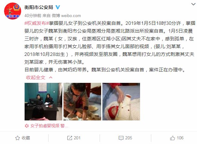 5日,多个微信群中流传着两段婴儿被虐待视频,引发网友关注。当天下午4时许,绵阳市公安局官微@绵阳网警巡查执法发微博全网征集线索。当晚6时,虐婴母亲魏某到衡阳市公安局投案自首。
