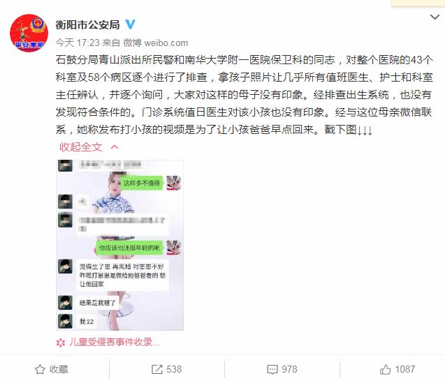 石鼓分局青山派出所民警和南华大学附一医院保卫科的同志,对整个医院的43个科室及58个病区逐个进行了排查,拿孩子照片让几乎所有值班医生、护士和科室主任辨认,并逐个询问,大家对这样的母子没有印象。经排查出生系统,也没有发现符合条件的。门诊系统值日医生对该小孩也没有印象。经与这位母亲微信联系,她称发布打小孩的视频是为了让小孩爸爸早点回来。