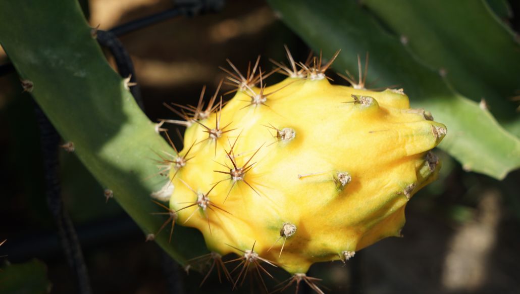 除了这种青色火龙果,这种黄色火龙果,也很吸引人。参展商介绍这个品种来自于厄瓜多尔,它的名字叫厄瓜多尔燕窝果。它的果肉非常透明,它的果籽比一般的火龙果要大,亩产也能达到三到四千斤,产量非常高 糖度也非常不错。