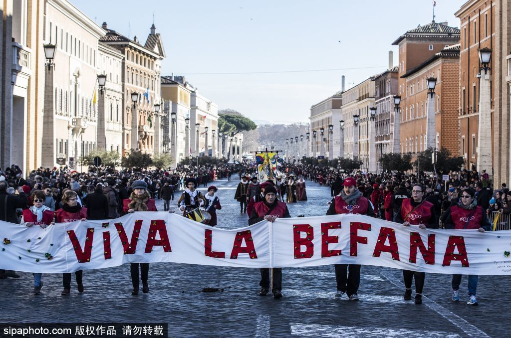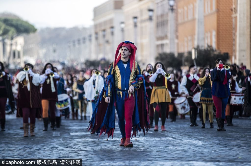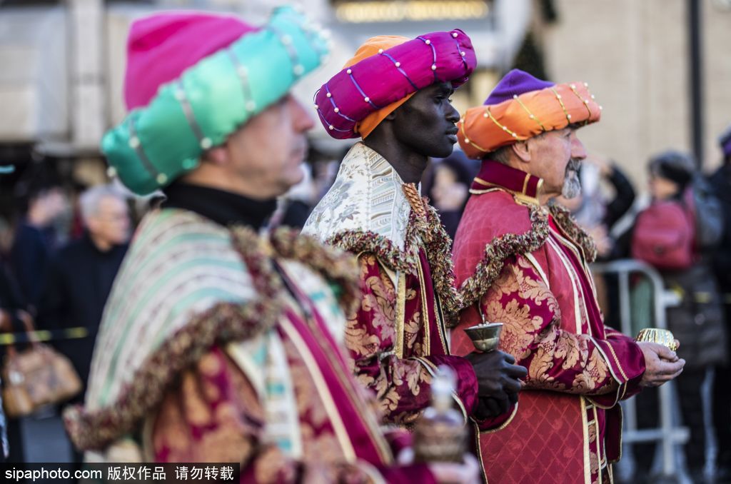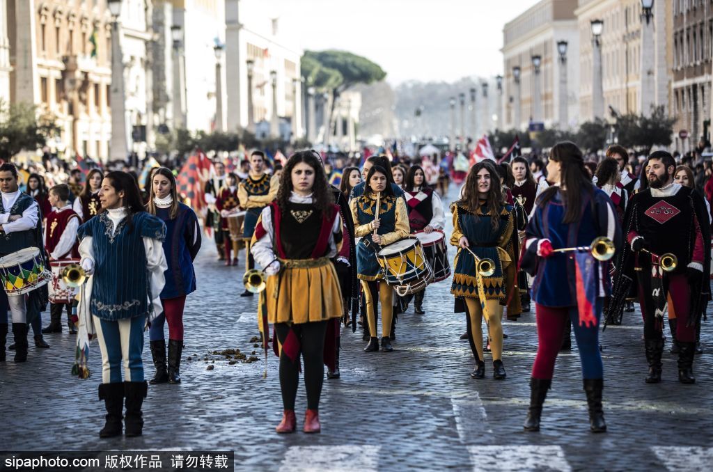 当地时间2019年1月6日,意大利罗马,意大利罗马协和街传统的Ephiphany游行正在进行中,人们身着传统服饰,场面十分壮观。(图源:希帕中国)
