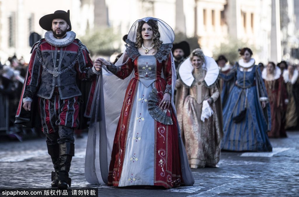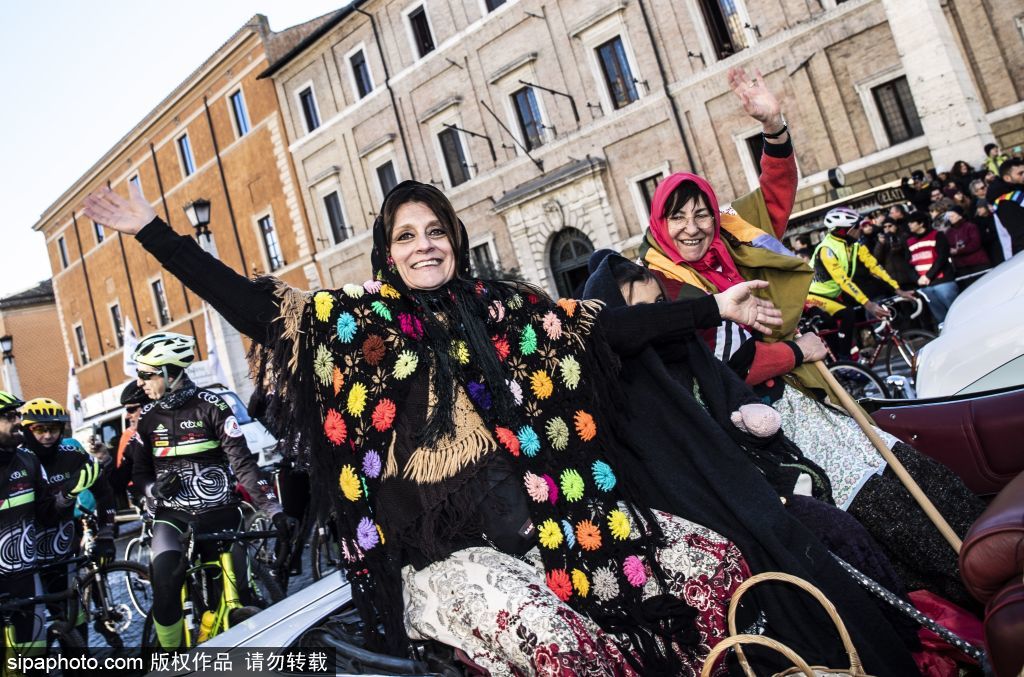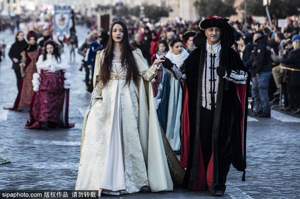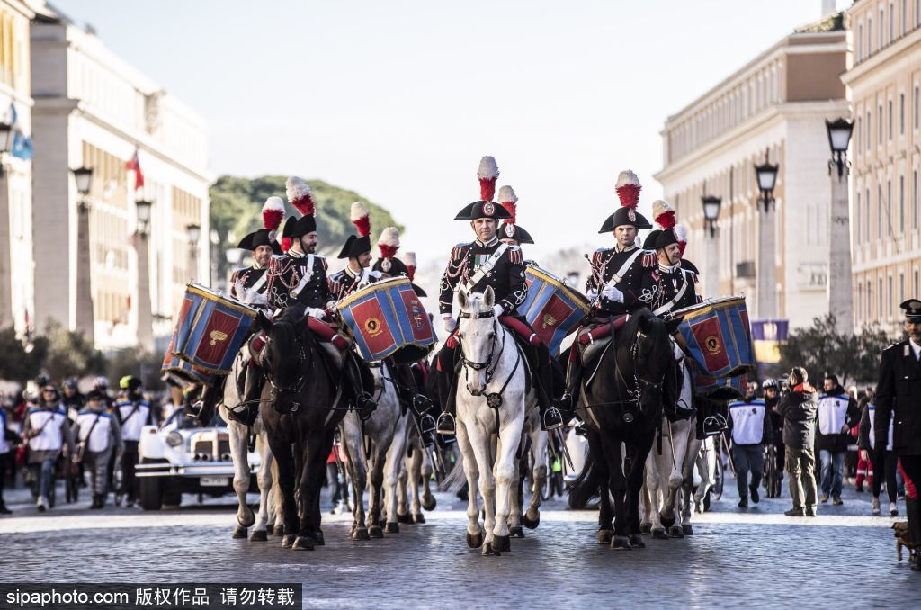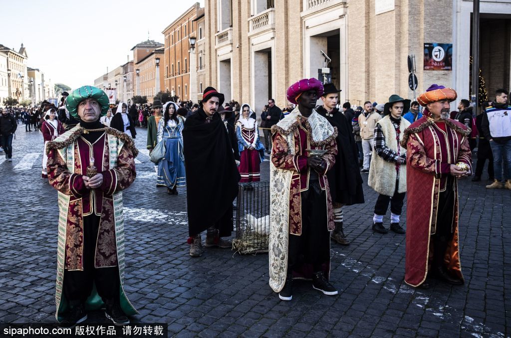 当地时间2019年1月6日,意大利罗马,意大利罗马协和街传统的Ephiphany游行正在进行中,人们身着传统服饰,场面十分壮观。(图源:希帕中国)