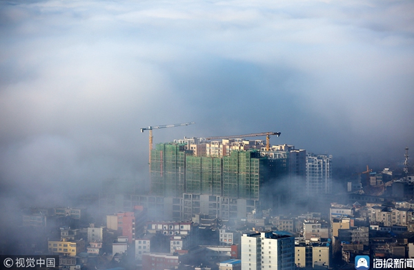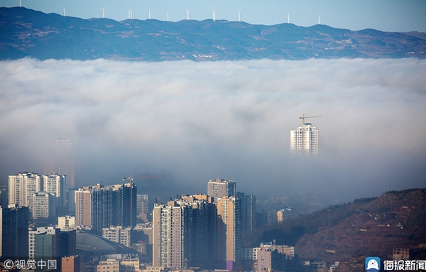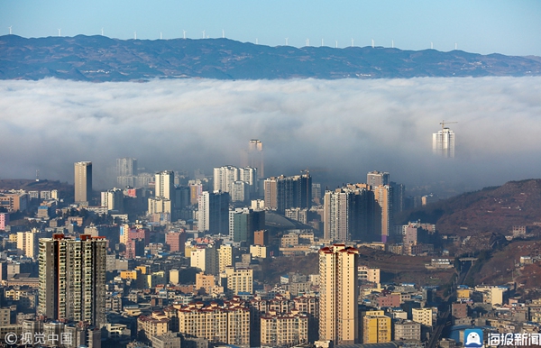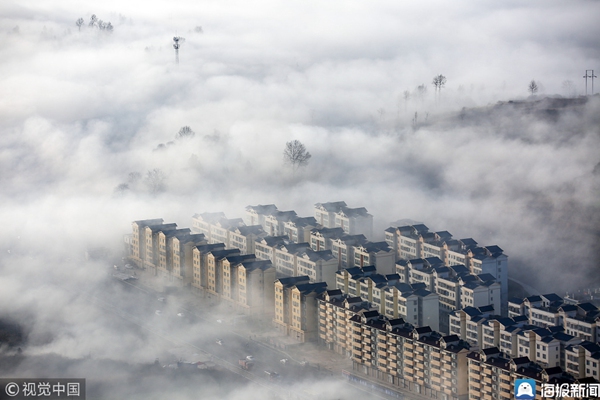 2019年1月11日,贵州毕节,威宁县城区上空出现平流雾景观,建筑物、远山、树木在雾海中若隐若现,宛若仙境。