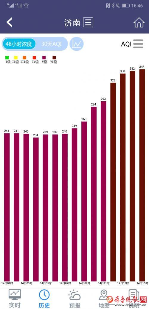 今天一早,本以为可以迎着朝阳上班,谁知由于冷空气势力较弱,昨天夜间济南又再次被“霾伏”。据济南环境APP显示,今天截至15时,济南的空气质量指数在234至345之间,中午12点时,空气质量由重度污染上升为严重污染。今早起来,雾气大,济南市气象台在凌晨4:30发布了大雾黄色预警,直到10:50预警才解除。