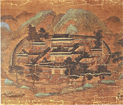 辋谷是一条狭长的峡谷, 长10余公里,呈西北——东南走向。峡谷的东西两侧是连绵的群山, 谷北口在蓝田县城南。《蓝田县志》说“旧志辋川口即晓山之口,去县南八里,两山对峙,川水从此流入溺,其路则随山麓凿石为之,约五里,甚险狭,即所谓扁路也。过此则豁然开朗,此第一区也, 团转而南凡十三区, 其胜渐加,约三十里至鹿苑寺即唐清源寺,则王维别墅。”蓝田县南部诸山西自陕西长安、柞水县入境, 东南至商县出境, 绵延百余里。其间有若干南北走向的峡谷,这些峡谷自然地成为一条条通道。辋谷中还有一条河流——辋水,唐时流量较大, 可以泛舟、通航。石拓本《辋川图》所画辋口庄王维宅第前的辋水上, 即有船两只。一只小船顺流而下, 乘坐两人,一人站立船尾持竿撑船, 一人弯腰手持长叉立于船头;另一只较大的船逆流而上, 乘坐五人一马,似乎是官员和他的随从。