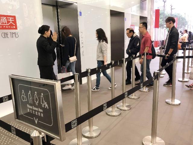 类似情形,时代广场、SOGO等大型商场有,公司聚集的写字楼有,小店扎堆的楼宇也有。香港地域狭小,不少餐馆、小商铺都往高空发展。去这些餐馆吃饭,电梯门口总会有保安员引导排队,规规矩矩,一丝不苟。
