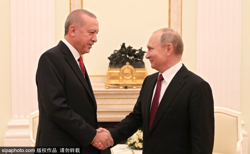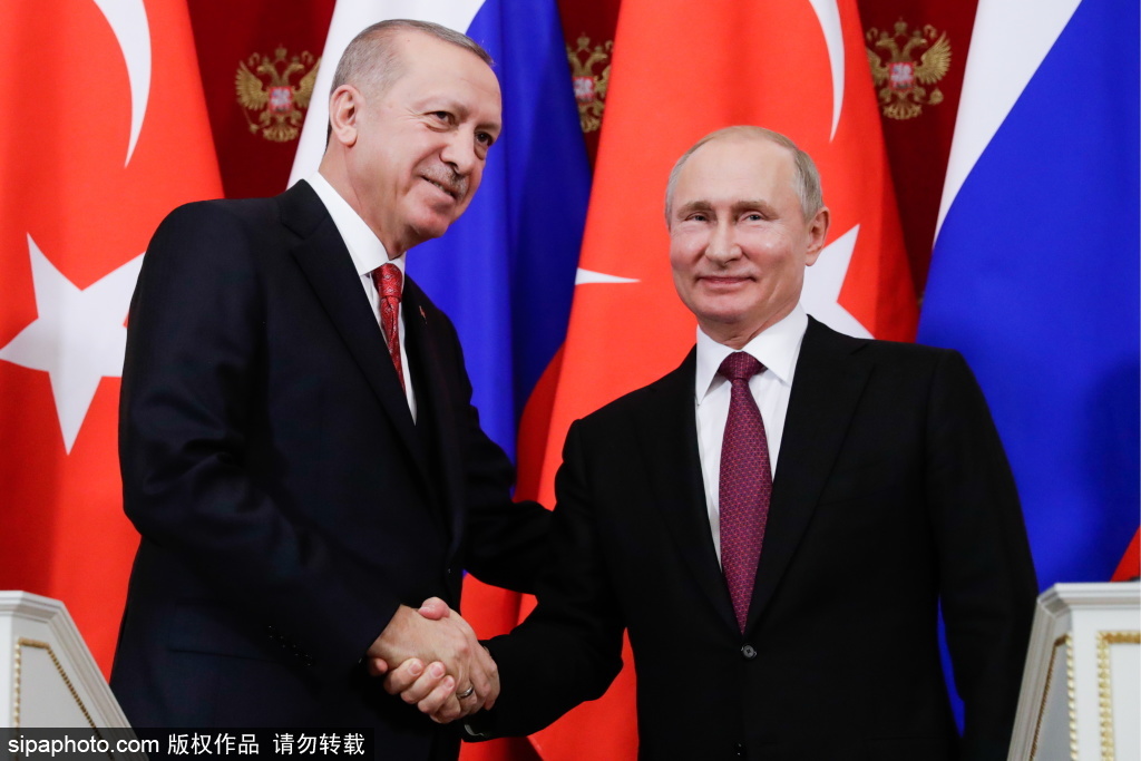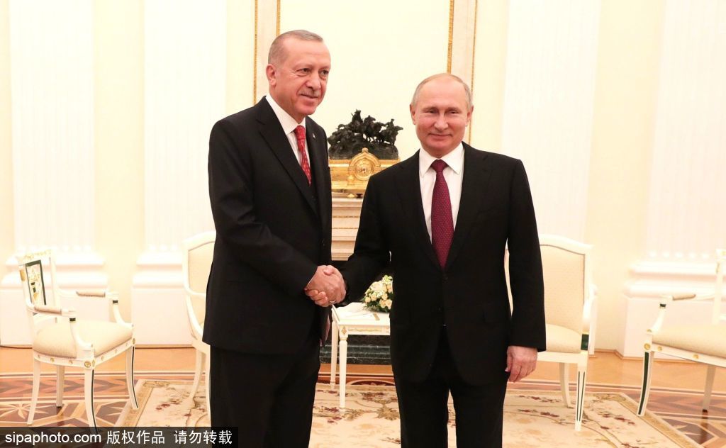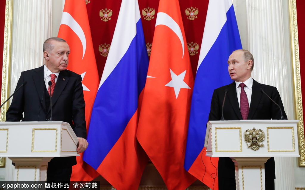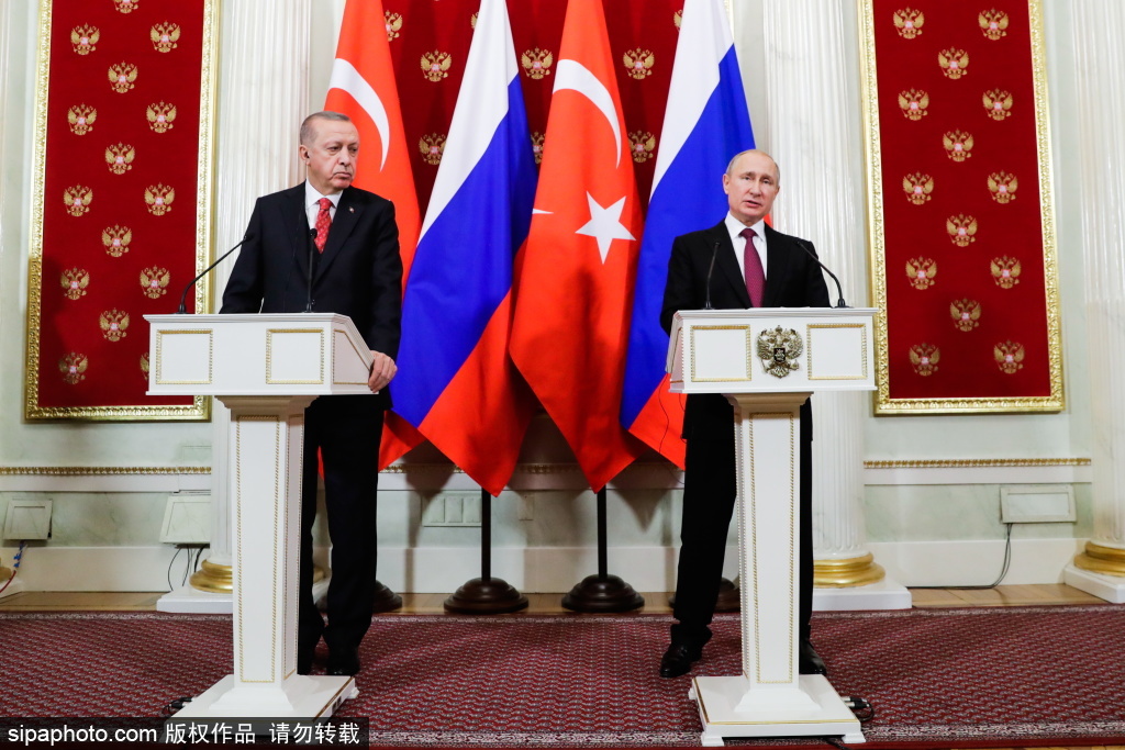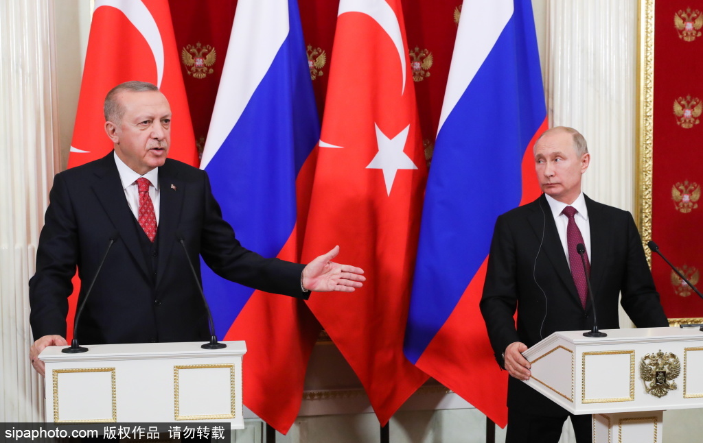 当地时间2019年1月23日,俄罗斯莫斯科,土耳其总统雷杰普·塔伊普·埃尔多安(左)和俄罗斯总统弗拉基米尔·普京在莫斯科克里姆林宫就俄土会谈举行联合新闻发布会。(图源:希帕中国)