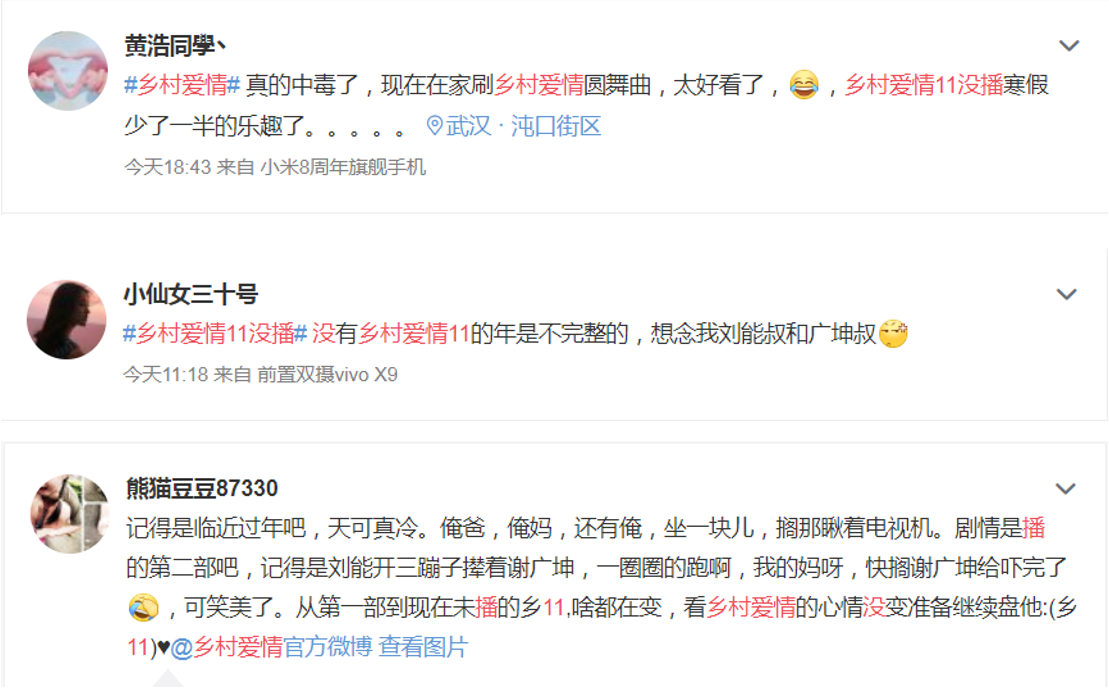 “乡爱”的跳票还在社交网络上掀起了一波浓浓的“回忆杀”。有观众回忆起多年前与爸妈一起看乡爱的场景,“啥都在变,看乡村爱情的心情没变,准备继续盘它。”七年来,一起看“乡爱”成了岁末的一大仪式,而剧中的象牙山“老铁”们,也成了乡爱粉的家人。在这部长寿剧王里,寻常人家的家长里短也绝不输《知否知否》式大家族的爱恨情仇。