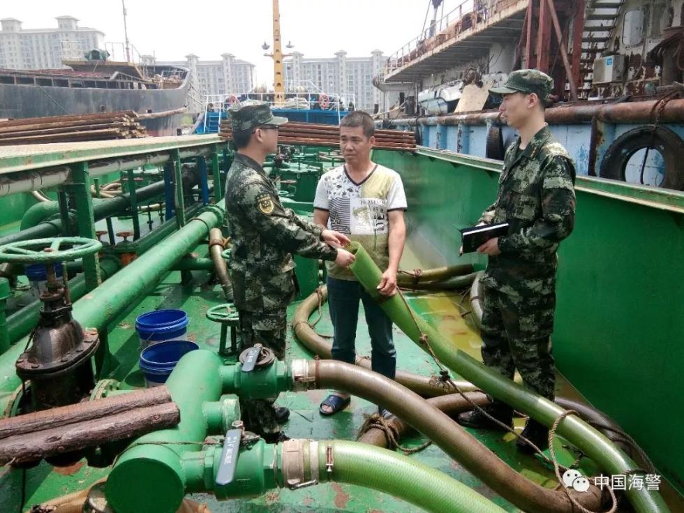江苏海警查获涉嫌走私油船,涉案嫌疑人正在指认相关物品(资料图)