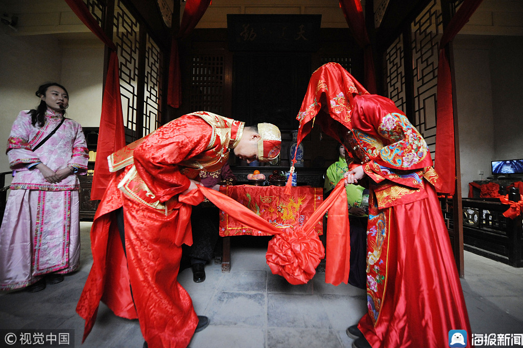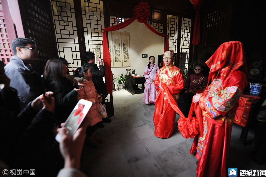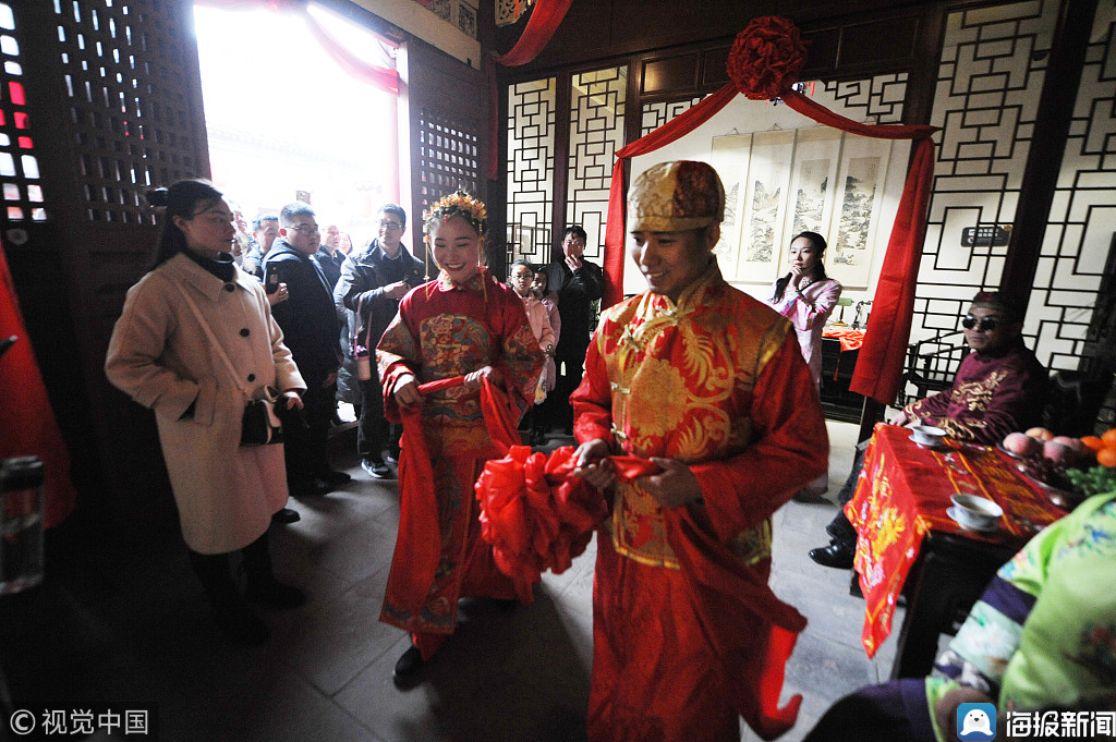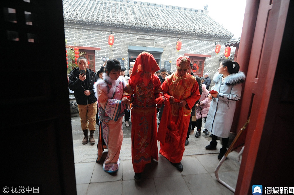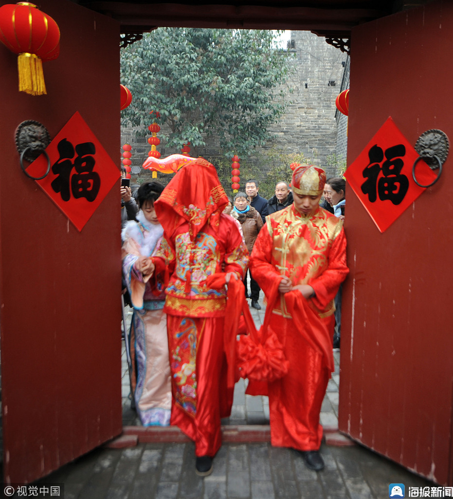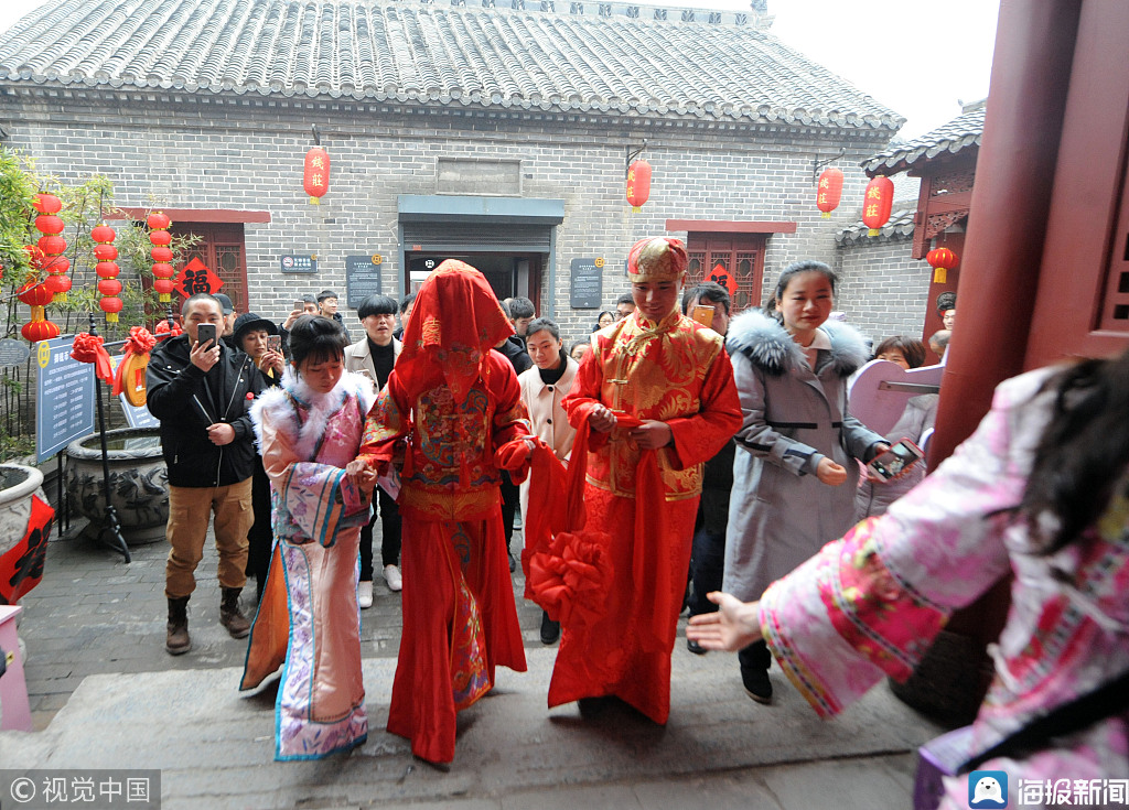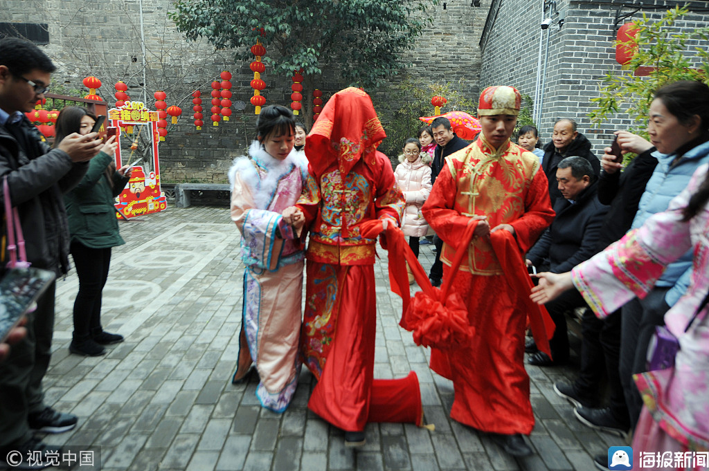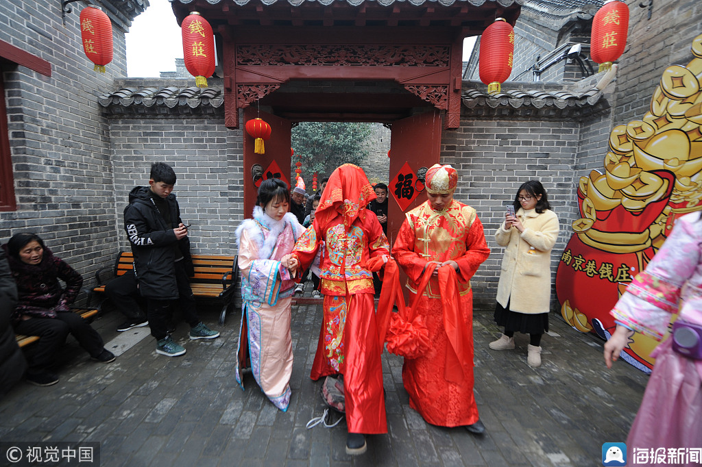 2月6日,安徽亳州,南京巷钱庄景区,工作人员正在表演传统民俗婚礼。当日是大年初二,安徽省亳州市南京巷钱庄景区上演传统民俗婚礼,跨火盆、过马鞍、拜天地、入洞房,洋溢着中国传统文化的吉祥与喜庆,为新春佳节增添了喜庆气氛。