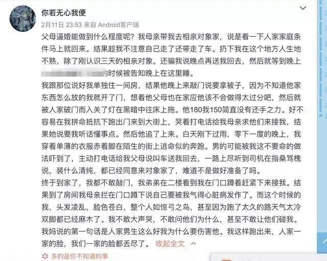 “你若无心我便”11日发文称,“父母逼婚能做到什么程度呢?”,讲述了其被父母逼婚,随后险些遭相亲对象强奸。“你若无心我便”在文中称,母亲将她带到相亲对象家中,随后自己悄悄回家,将她扔到认识三天的相亲对象家中。夜里,她险些被相亲对象强奸,奋力挣脱后回到家中,结果母亲不问女儿遭遇,反而责怪其从男方家跑出来,丢尽家里面子。