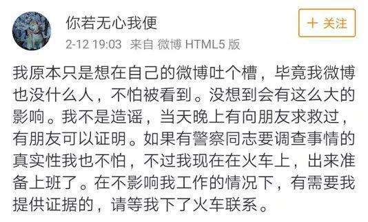 我原本只是想在自己的微博吐个槽,毕竟我微博也没什么人,不怕被看到。没想到会有这么大的影响。我不是造谣,当天晚上有向朋友求救过,有朋友可以证明。如果有警察同志要调查事情的真实性我也不怕,不过我现在在火车上,出来准备上班了。在不影响我工作的情况下,有需要我提供证据的,请等我下了火车联系。