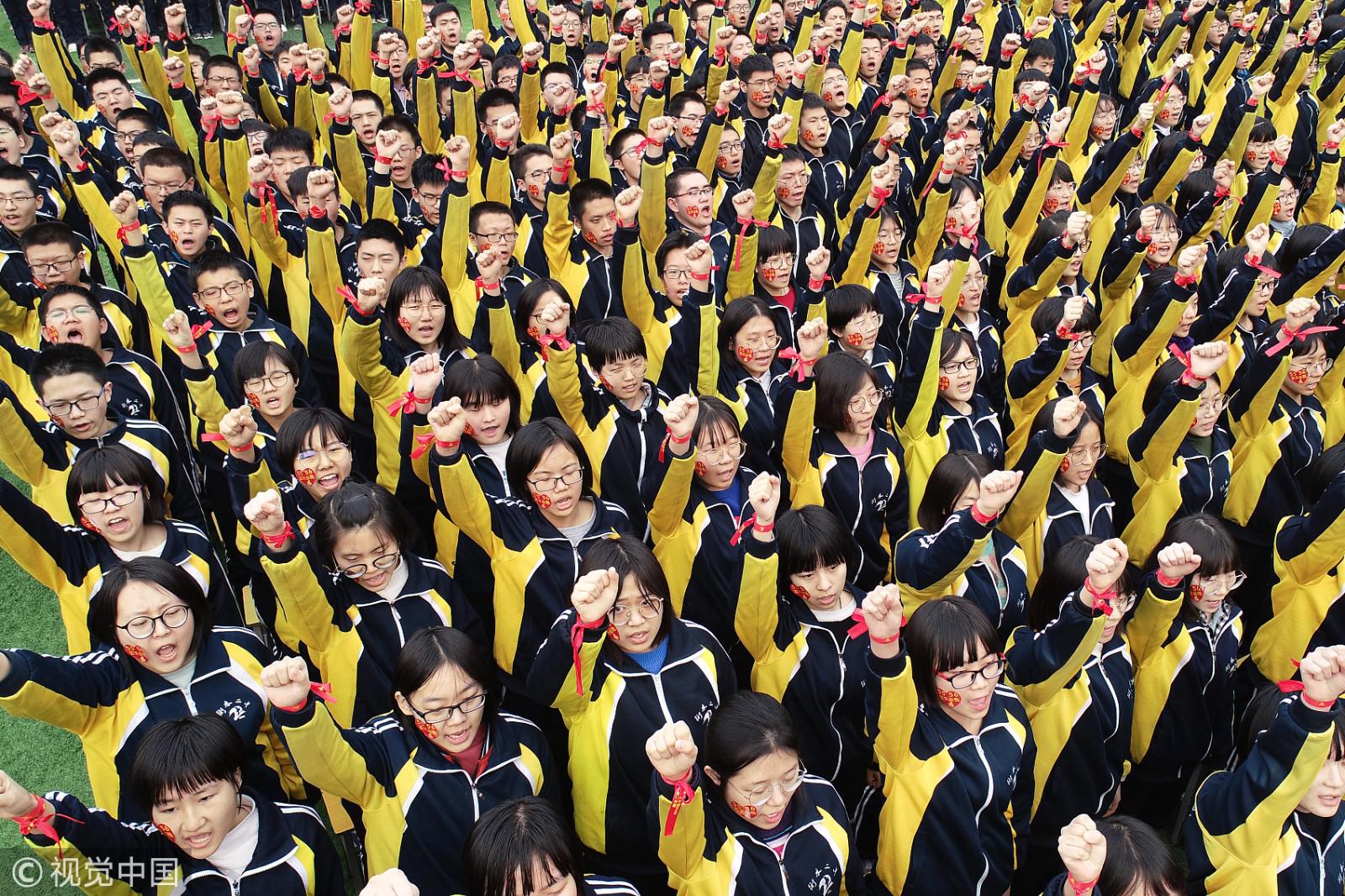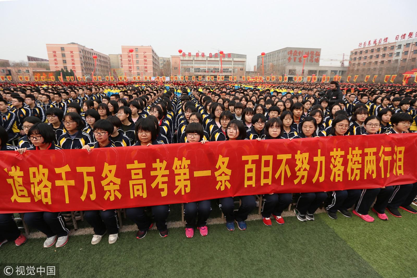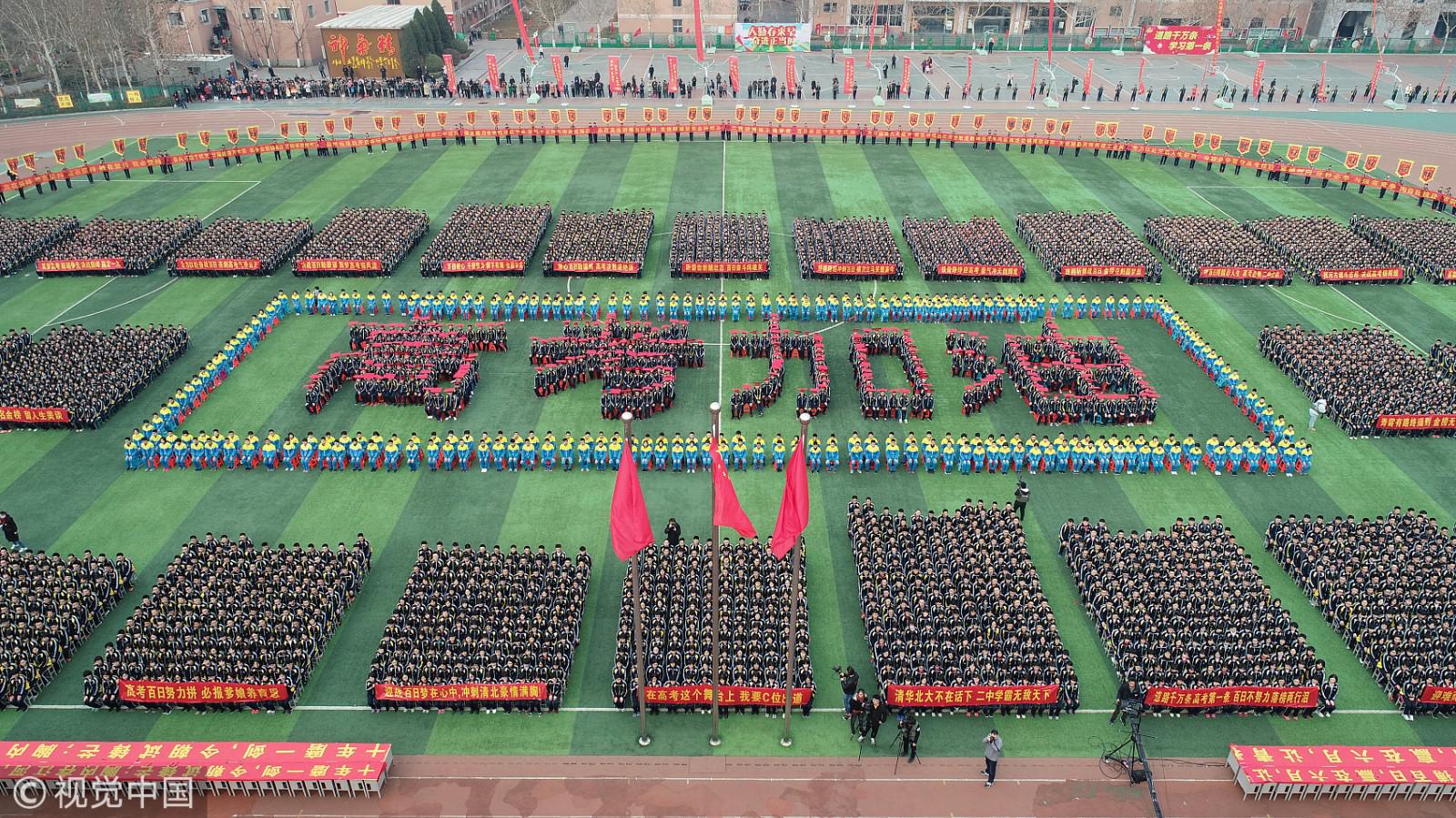 2019年2月26日上午,河北衡水二中举行了高考百日誓师励志动员大会。方阵中心的空地上,高二年级的300余名同学组成“高考加油”的巨型红字,为学哥、学姐备战高考加油。(图片来源:视觉中国)