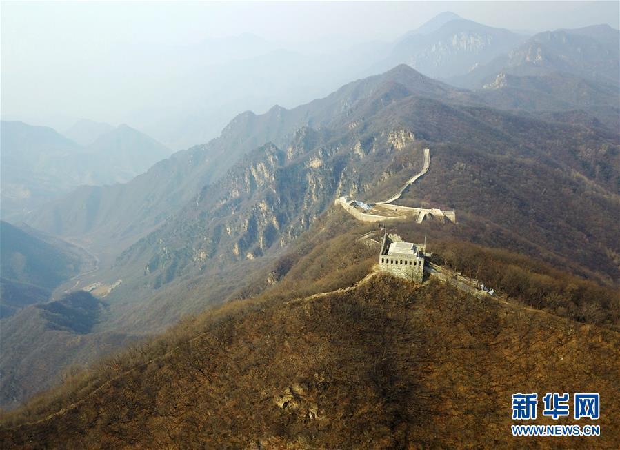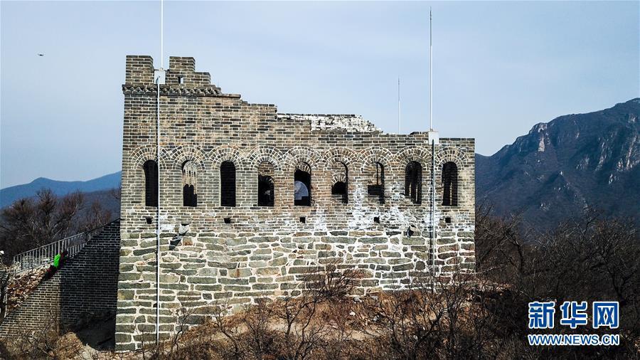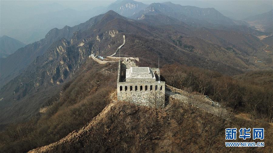 这是3月18日无人机拍摄的九眼楼长城。 九眼楼长城位于北京市延庆区四海镇,该楼是明代长城中建筑规模和形制最大的一座敌楼,因楼体为青砖砌筑,每边并排九个箭窗,故称“九眼楼”。 新华社记者 孟晨光 摄
