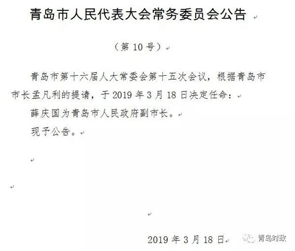 青岛市十六届人大常委会第十五次会议表决通过了人事任免案等事项,薛庆国任青岛市人民政府副市长。