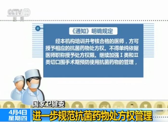 《通知》明确规定,经本机构培训并考核合格的医师,方可授予相应的抗菌药物处方权。不得单纯依据医师职称授予处方权限。继续加强Ⅰ类和Ⅱ类切口围手术期预防使用抗菌药物的管理,改变过度依赖抗菌药物预防手术感染的状况。强调“能口服不肌注,能肌注不输液”的原则。各地要根据抗菌药物使用监测结果,采取针对性措施,减少不合理的预防性使用和静脉输注抗菌药物。