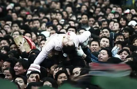 这时,一名女乘客晕倒在人群中,众乘客抬高以接力的方式把她送出人群去救治。