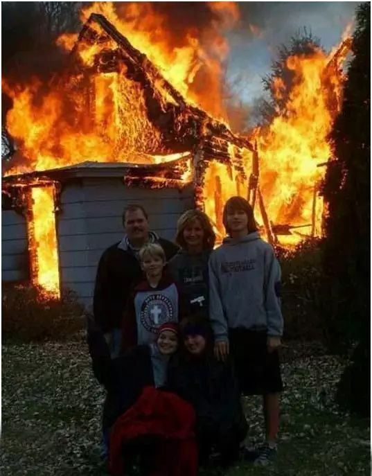 一家人与自己熊熊燃烧的房子最后一张合影。